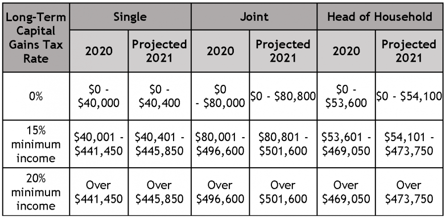 - The brackets for long-term capital gains for 2020 and the projected 2021 rates are shown below. Long-term capital gains are subject to a lower tax rate, so investors may wish to consider holding on to assets for over a year to qualify for those rates.